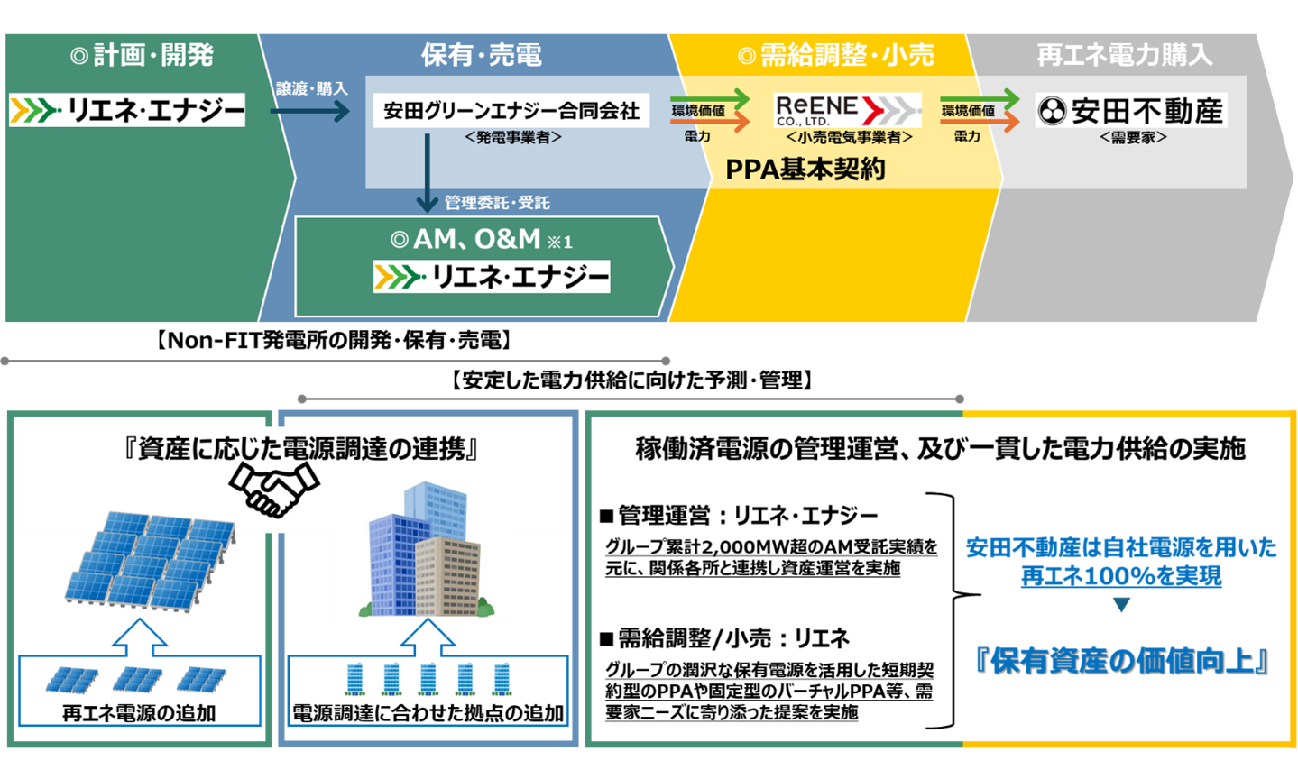 本PPAは、安田不動産が100%出資するSPC「安田グリーンエナジー合同会社」が関東エリアに保有する太陽光発電所で発電した再生可能エネルギー由来の電力を、小売電気事業者であるリエネを通じて需要地へ供給するものです。安田不動産は、本PPAによる自社保有電源由来の再エネ電力と、リエネから調達したFIT発電所由来の実質再エネ電力を組み合わせる事で、需要地の100%再エネ化を実現します。なお、本スキームにおいて、リエネ・エナジーは需要量に合わせた発電所の開発・譲渡、および管理・運営を担います。本PPAによる電力供給は2026年4月1日より開始し、年間約10,345t-CO₂の CO₂削減※3に貢献いたします。